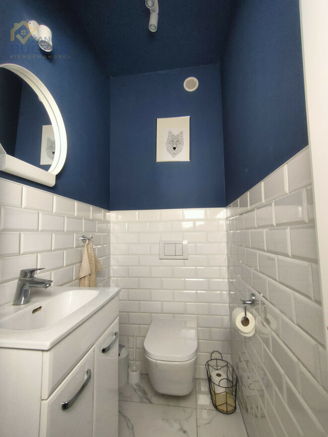 Toaleta: Na parterze znajduje się toaleta wykończona w eleganckim stylu z elementami granatu.