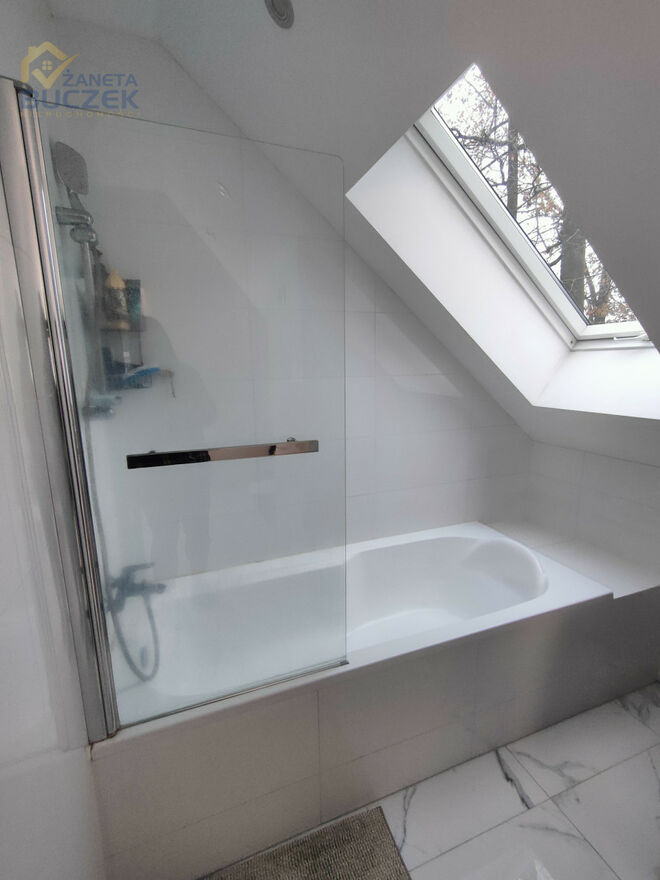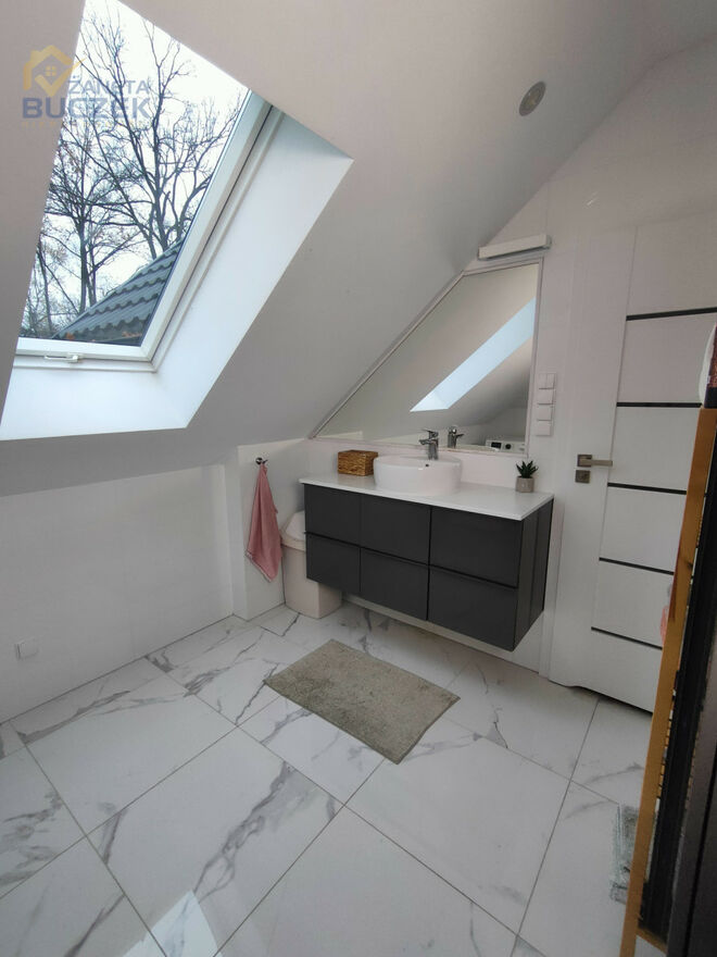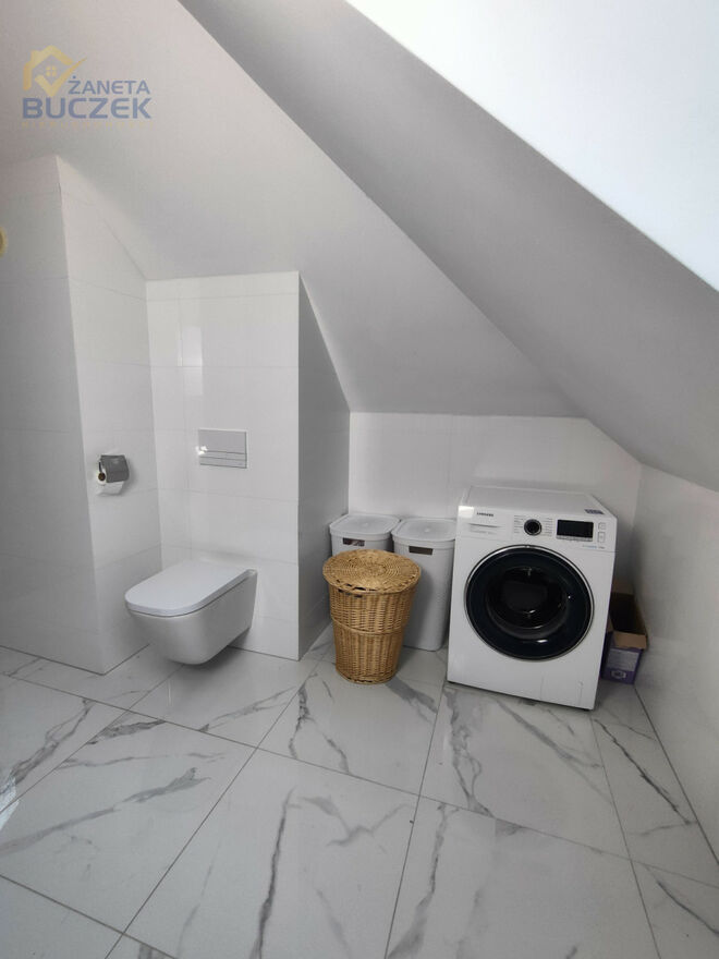 Łazienka główna: Stylowa i jasna, urządzona z dbałością o detale. Wykończona błyszczącym białym gresem z efektem marmuru, który pokrywa również wannę. Pojemna szafka podumywalkowa w kolorze grafitu oraz duże lustro pod skośnym dachem tworzą nowoczesną i funkcjonalną przestrzeń relaksu. Dodatkowo w łazience zaaranżowano praktyczne miejsce na pralnię.