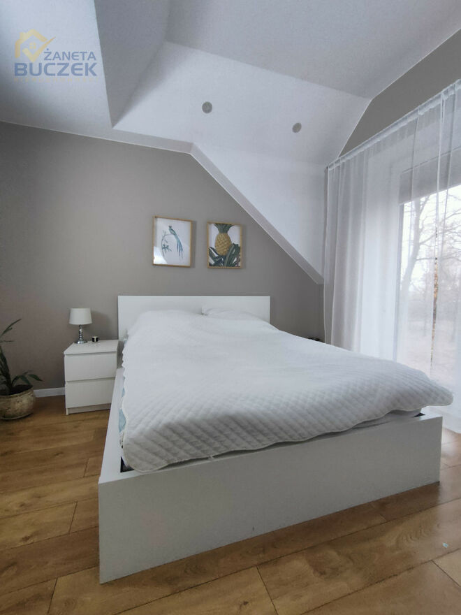 Sypialnie: Dwa doskonale doświetlone pokoje, wyposażone w okna dachowe oraz standardowe, zapewniające dużo naturalnego światła. Sypialnia główna z własną garderobą i sypialnia dziecięca.